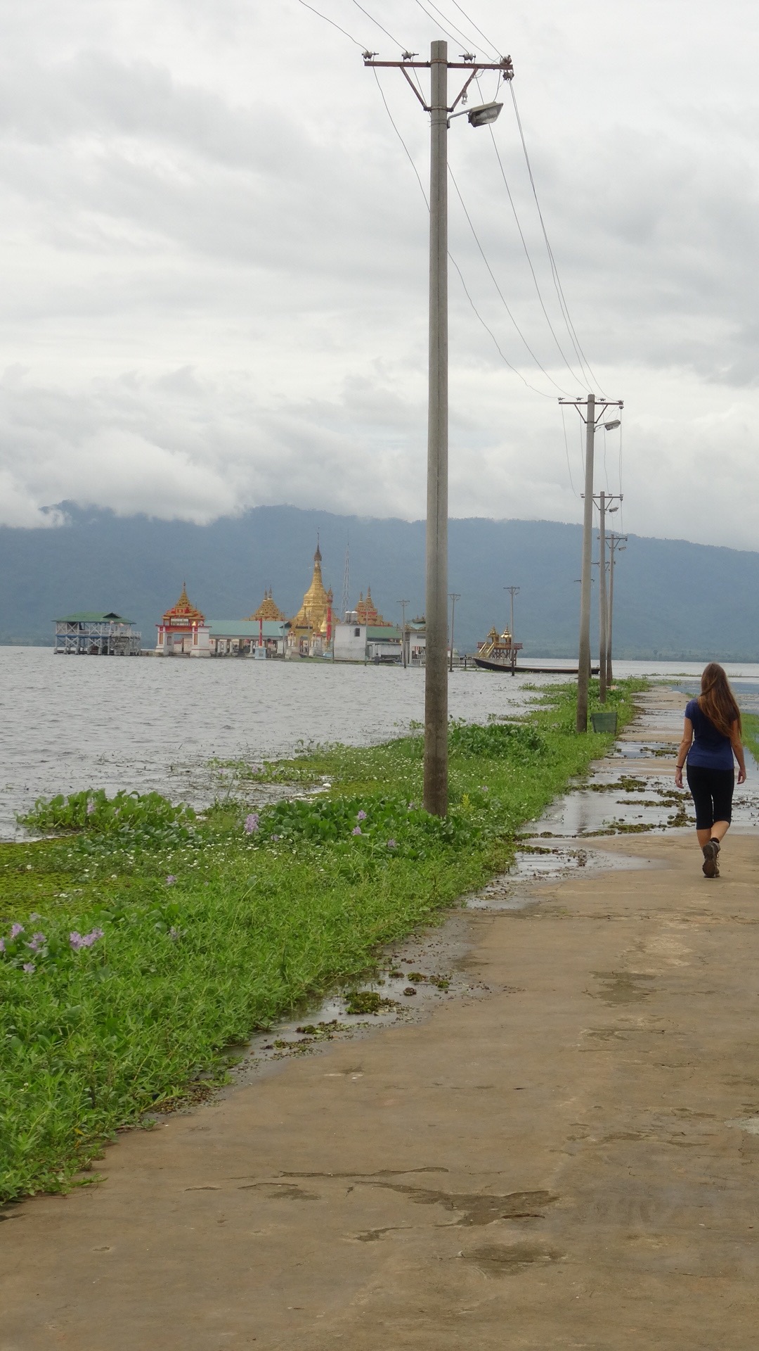 Thursday 16th June 2016 – We are woken from the serenity of our sleep by heavy rain drumming down on the roof of our cosy bedroom. Peering out of the window I sight a misty lake and murky mountains shrouded beyond. We get up and armour ourselves with waterproofs…then tiptoe through the downpour to a local restaurant that serves fresh pancakes with honey washed down with Myanmar tea…just what we need to warm the cockles! The rain continues to gush down from the heavens so we decide on a lazy day. The view from our room and the hotel balcony is wonderfully scenic. Our hotel stands on stilts right on the lakeside…it really is a room with a view. Below our window is muddy, wet marshland before you can reach the lake itself. It is here that animals come to graze…continually munching away to their hearts content…pigs, cows and chickens join together in a feast of the land. The pigs are my favourite, you always know when they’re around, showing their happiness with loud snorting and grunting as they look for their next tasty morsel to snuffle! During our restful day, I read my book and chatted to other guests while Aaron enjoyed some cave time on the iPad. In the evening we dined on vegetable noodles and drank the local Myanmar beer.