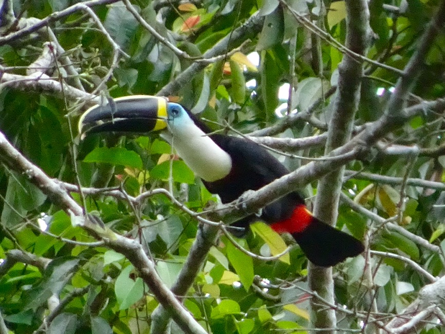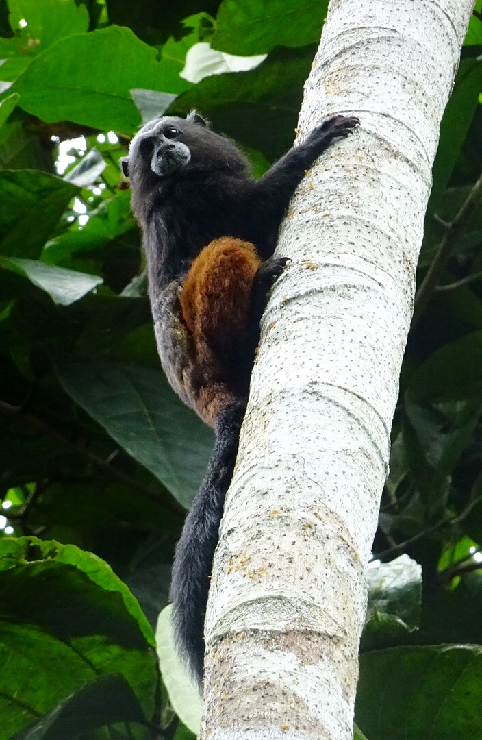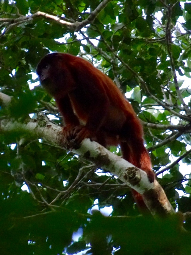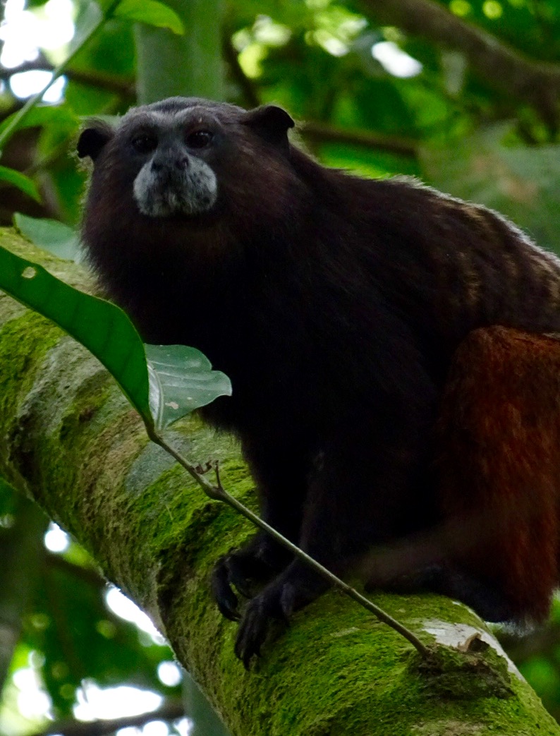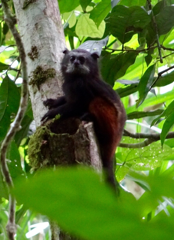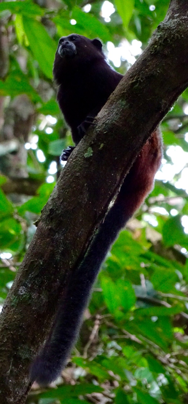 Monday 28th November 2016 – After more wholesome food for breakfast we jumped in the boat and went up river. While disembarking Simon spotted jaguar and ocelot tracks in the mud…they must have visited the river for an early morning drink. Walking through the Amazon we stopped to fish for piranha. I caught a dogfish, Michael caught a yellow belied piranha and Aaron caught…nothing! While fishing two beautiful saddleback tamarins danced through the trees behind us…we followed and watched them bewitched by their loveliness. By the water, on the bank, we spotted Watson turkeys, tiger herons, kingfishers, blue necked guans, toucans and chestnut eared aracaris. Back at base we watched the adorable tapir have a dip in the river then we lunched and were off again to see the giant emergent trees of the rainforest…Amadrillio and Saber trees. The indigenous people believe that at 12 noon and 12 midnight, bad spirits come to shelter in these giant trees so the people refuse to pass them at these times. It was 3pm by now so Simon was happy to show us these impressive emergents. Next was a plant that when crushed gives off a purple pigment. The Tacana people use it to paint their bodies and faces for special occasions. Aaron rolled some in his hands and they turned bright, beetroot purple! More monkeys and some glorious channel billed toucans later we arrived back at camp. Again, after dinner, Aaron went into the night. I joined him for a while spying some hairy legged tarantulas and a poison dart frog…then he continued…alone in the Amazon…while I slept to the magical sounds of the jungle.