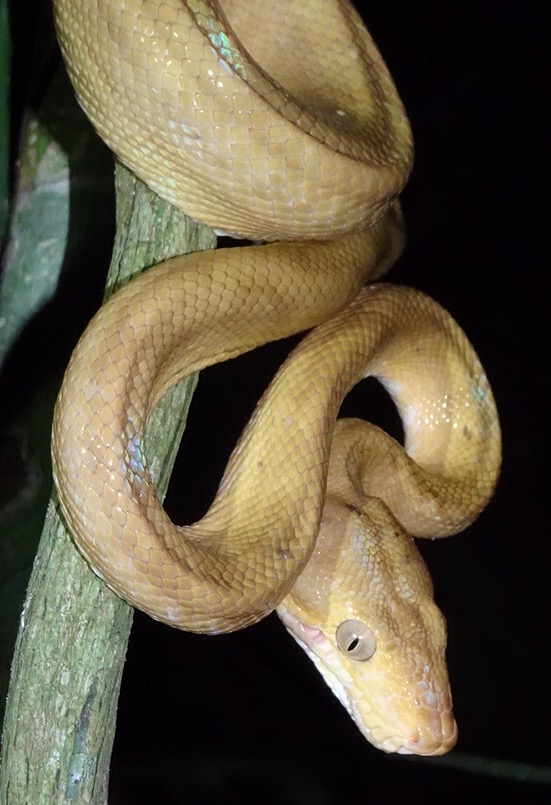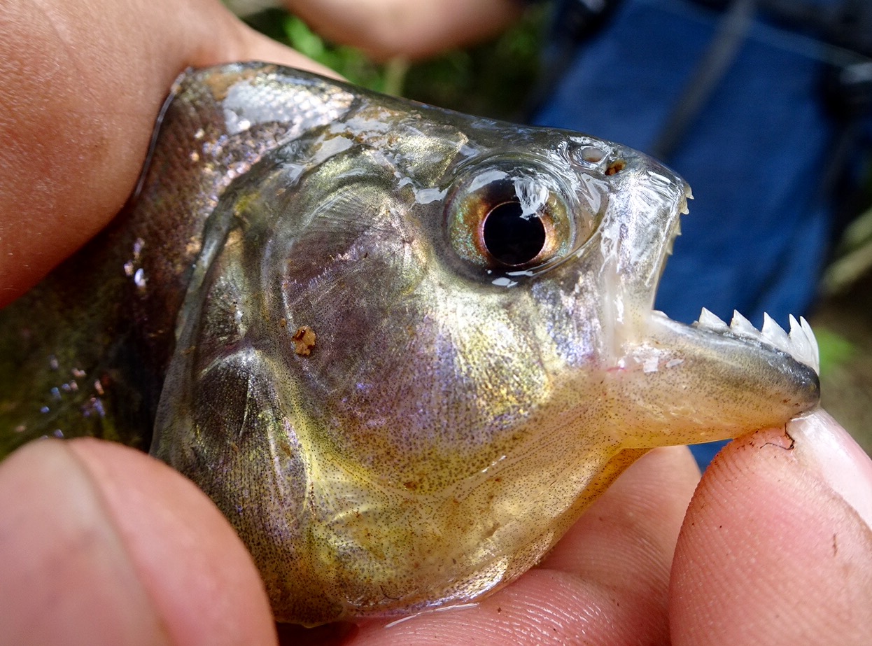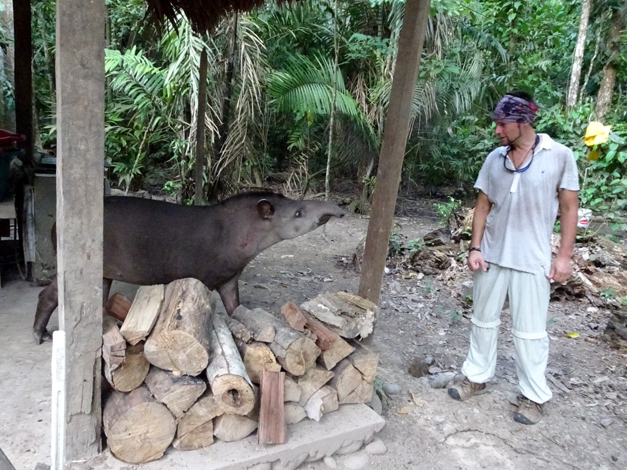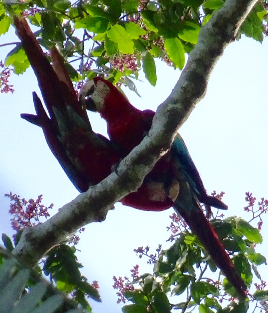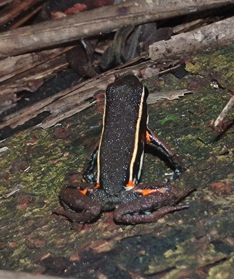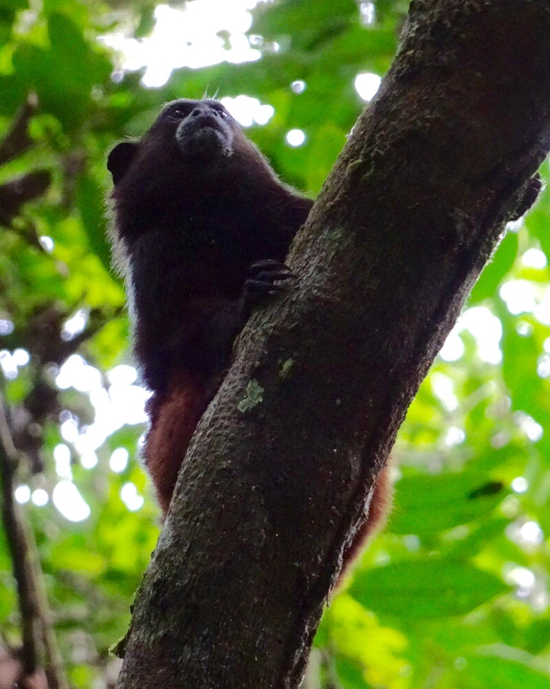 Monday 28th November 2016 – After more wholesome food for breakfast we jumped in the boat and went up river. While disembarking Simon spotted jaguar and ocelot tracks in the mud…they must have visited the river for an early morning drink. Walking through the Amazon we stopped to fish for piranha. I caught a dogfish, Michael caught a yellow belied piranha and Aaron caught…nothing! While fishing two beautiful saddleback tamarins danced through the trees behind us…we followed and watched them bewitched by their loveliness. By the water, on the bank, we spotted Watson turkeys, tiger herons, kingfishers, blue necked guans, toucans and chestnut eared aracaris. Back at base we watched the adorable tapir have a dip in the river then we lunched and were off again to see the giant emergent trees of the rainforest…Amadrillio and Saber trees. The indigenous people believe that at 12 noon and 12 midnight, bad spirits come to shelter in these giant trees so the people refuse to pass them at these times. It was 3pm by now so Simon was happy to show us these impressive emergents. Next was a plant that when crushed gives off a purple pigment. The Tacana people use it to paint their bodies and faces for special occasions. Aaron rolled some in his hands and they turned bright, beetroot purple! More monkeys and some glorious channel billed toucans later we arrived back at camp. Again, after dinner, Aaron went into the night. I joined him for a while spying some hairy legged tarantulas and a poison dart frog…then he continued…alone in the Amazon…while I slept to the magical sounds of the jungle.