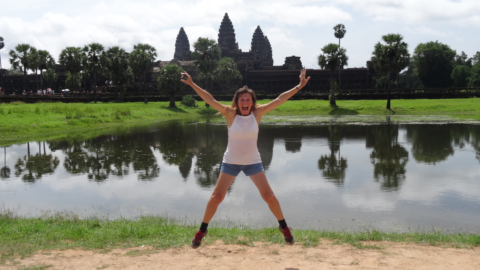 Thursday 14th July 2016 – Today we had booked a tuk tuk for the day to see the temples of Angkor. Mouse…our driver arrived promptly at 8.00am…I was so excited, Angkor Wat is one of the most famous and beautiful temples in the world…and here we were to bask in its splendour and glory. We whizzed off to purchase our tickets and then headed for the largest religious monument in the world! Excitement swept through me…Aaron had been here before 15 years prior…but for me it was my first time to see such magnificence. As we approached we sighted the moat framing and surrounding the rectangular outer wall. On entering the complex we saw carvings of heavenly nymphs adorning the historical archways and paths. The grandeur and harmony of the architecture was awe inspiring. Angkor Wat is the heart and soul of Cambodia and a source of fierce national pride. History states that it was originally constructed as a Hindu temple of the Khmer Empire and gradually transformed into a Buddhist temple towards the end of the 12th Century. It became a symbol of Cambodia even appearing on its national flag and the country’s prime attraction for visitors. I could see why this was so as we continued towards the central complex. There before us stood the ultimate expression of Khmer genius…a temple stunning for both its grand scale and its incredible detail. At the centre of the temple stood a quincunx of towers. It was made up of 3 stories. The sun enveloped us as we climbed…for the final storey your upper arms and legs need to be covered…out came Aaron’s waterproofs…better known as his ‘hornet outfit’ and with sweat pouring from me upwards we climbed…wicked giggling coming from my partner in crime as he revelled in my discomfort. It was worth all the pain of severe perspiration as we surveyed the view…my eyes holding onto its resplendence before me. Our second temple was Bayon…an enigmatic and unusual temple…almost alive with the sublime, melancholy faces embellishing it. Next we visited Baphoun temple and the Royal Palace…yellow, buttercup coloured butterflies glided around the entirety of this temple. After lunch we climbed the steep original steps of Ta Tanei temple…again all this done in Aaron’s hornet outfit…I so wished someone had warned me about the dress code before setting off this morning! Penultimately we arrived at Aaron’s favourite shrine…Ta Prohm. This temple has been left for nature to mould with it…it was extraordinarily beautiful. Silver like trees grow in, around and on the architecture…an authentic union of natural and man made exquisiteness…my eyes feasted on this perfect picture. Our last temple was Banteay Kdei…such a contrast to the others, so quiet, peaceful and serene. What a glorious sight seeing day we had experienced and to top it all off wild capuchin monkeys appeared as we exited this truly spiritual site.