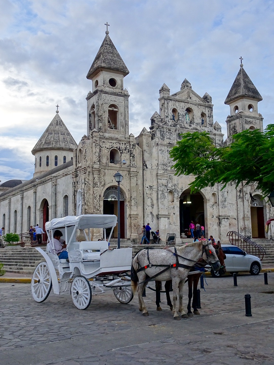 Saturday 15th October 2016 – Today we would travel to the cobblestoned streets of Granada – considered one of the prettiest cities in Central America. We chowed down on eggs and toast, donned our backpacks and proceeded through the busy market to the bus station. We hopped on a minibus to Managua where we took another minibus straight to the Central Park in Granada – total journey time about three hours. Well cared for horses pulled visitors around the cobbled streets in decorated carriages, locals and tourists alike relaxed on park benches watching passersbys and birds sang from manicured trees. We made our way past colonial facades and beautiful courtyards to Hostel La Mexicana where Alysa gratefully cooled off in front of a fan. When we were recovered we had a look around town. Alysa said the view of the terracotta roofs from the top of Iglesia de la Merced reminded her of Italy. We took a stroll down to Lake Nicaragua where sweethearts promenaded along the shore in a prelude to Saturday night festivities. On our way back to town we passed a neglected courtyard strewn with statues. We were surprised to see such pieces of art just lying around like that and went to take a closer look. Only on close inspection, where some damage had occurred could you see the statues were made of expanded polystyrene. The effect was so good that on undamaged pieces you really couldn’t tell them apart from actual stone sculptures. Before long it was dark and we found ourselves on Calle La Calzada where the party had already started. Well heeled locals and tourists were serenaded at open air tables while street performers and beggars added colour to proceedings. We had a few drinks and enjoyed the vibrant, festive, noisy, happy atmosphere. A mariachi band appeared at our table and belted out ‘One Tala Mela’ in a whirl of embroidery and gold teeth – it was wonderful. Alysa had spotted some hungry looking dogs so on our way home we stopped to buy some hotdogs from a vendor. They must have been pretty unappetising as not one of the dogs would give them more than a cursory sniff.
