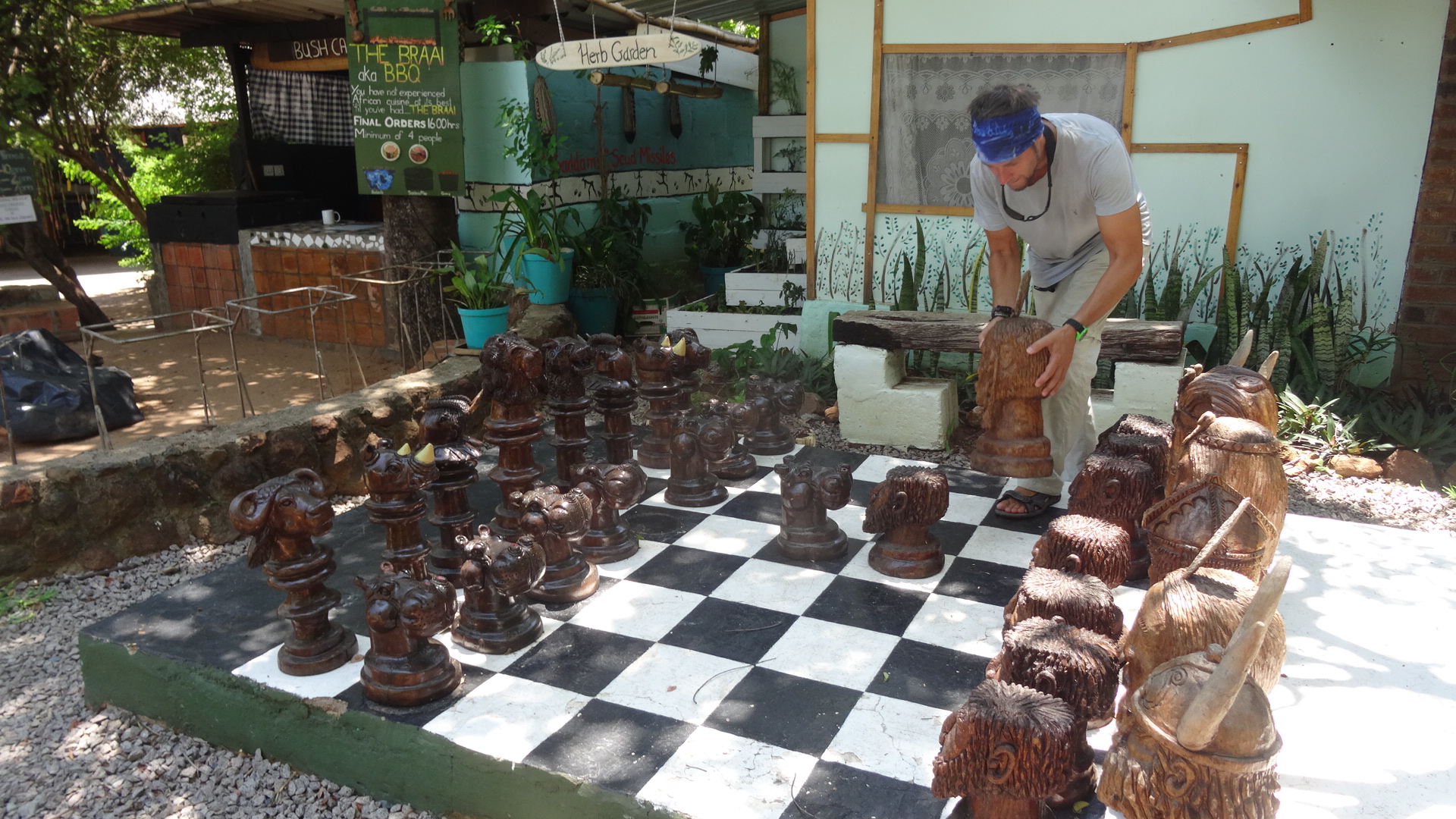 Saturday 6th February 2016 – 5.15am sharp was our wake up call! We wanted to get to Victoria Falls today if we could. We arrived via taxi at the bus rank where two large competing coaches were waiting. It was fierce competition as two groups of opposing men rushed to our taxi, fighting over their next potential passengers. Zimbabwe, so far, has been the most aggressive African country we have visited and people are literally fighting for food, jobs and survival hence tempers are frayed. This was even more evident when a young woman arrived and was physically pulled from one coach to the other until she eventually ended up on our coach shaken and very distressed. It was no surprise to us when men from our rival coach violently manhandled the individual who had won the passenger. It really was quite shocking and disturbing to watch. The fight for passengers continued until 8.30am when we finally departed amid much beeping and shouting…quite a chaotic scene indeed. En-route, while I napped, Aaron witnessed a baptism in the river, very biblical. I lost my patience with a local woman, when after we had endured two and a half days of full on travelling, she carelessly threw liquid out of her window while the coach was at full speed and typically it went all over me rather than out the window! I was none too pleased and verbally made it known to her. We arrived in Victoria Falls a at 3.00pm and found our oasis at Victoria Falls Backpackers…a tranquil, shady piece of paradise…it even had a giant chess set with locally carved chess animals and tribesmen to play with. We decided to treat ourselves to the best room in the house that night and in the evening chatted merrily to fellow backpackers from South Africa, Canada and America.