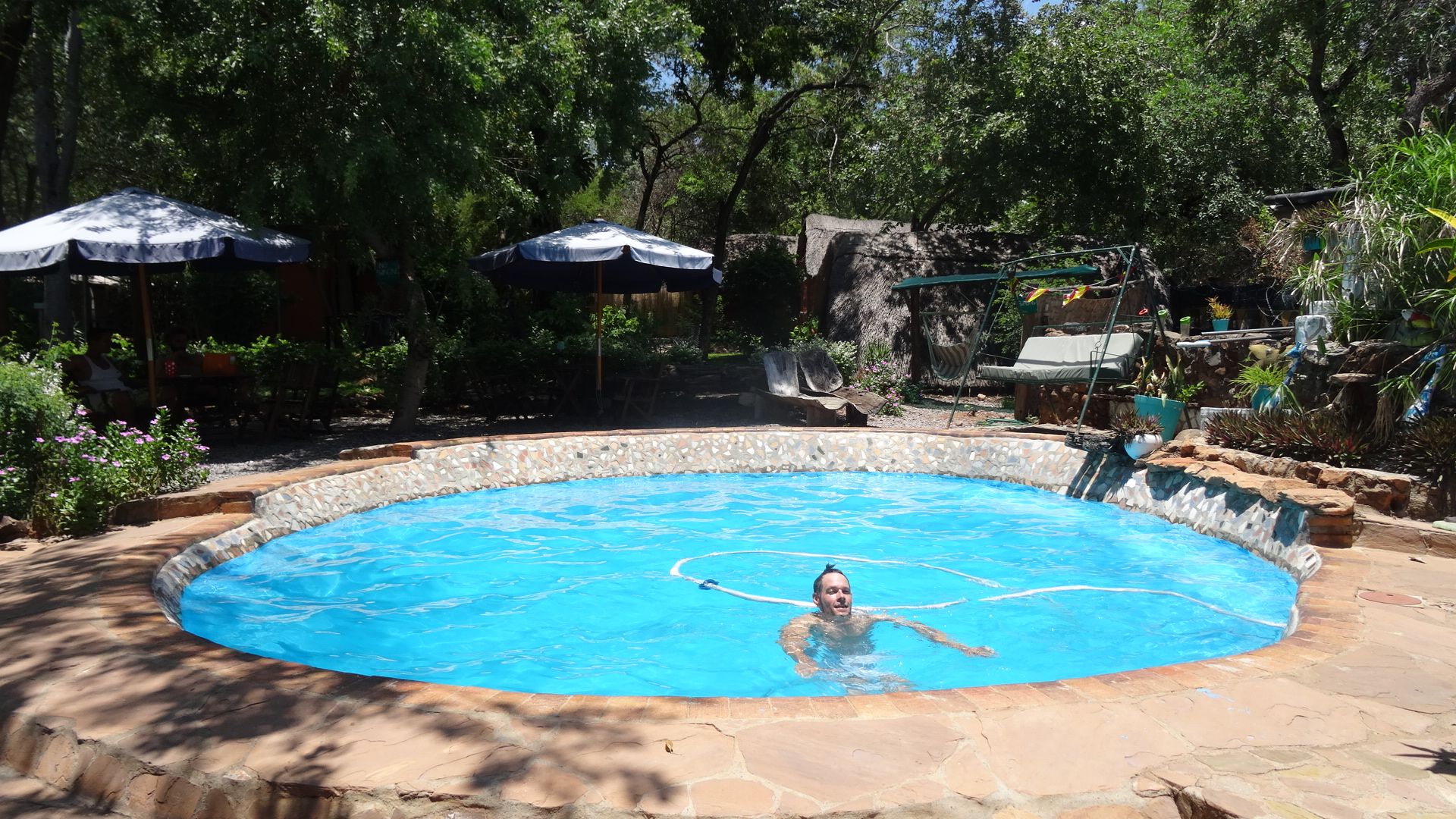 Sunday 7th February 2016 – After a glorious lay in till 9am we swapped rooms and moved into a small bedded tent (half the price of our room the previous night). We breakfasted by the pool on tea, fruit, yogurt and cornflakes. Deciding to delay visiting Victoria Falls till tomorrow, we caught up on chores for the day. Aaron blogged and I downloaded photos and organised washing while bees, dragonflies and butterflies hovered over the pool amidst the beautiful gardens. Later we shopped for food and took dips in the cool pool. That evening there was an impressive thunder storm and when we turned in for the night we were reduced to fits of giggles when we realised that the tent’s mosquito net was only really made for one person and not two! Giggling away, with Aaron’s face smothered by the net we eventually managed to nod off to the sounds of thunder and heavy rain.