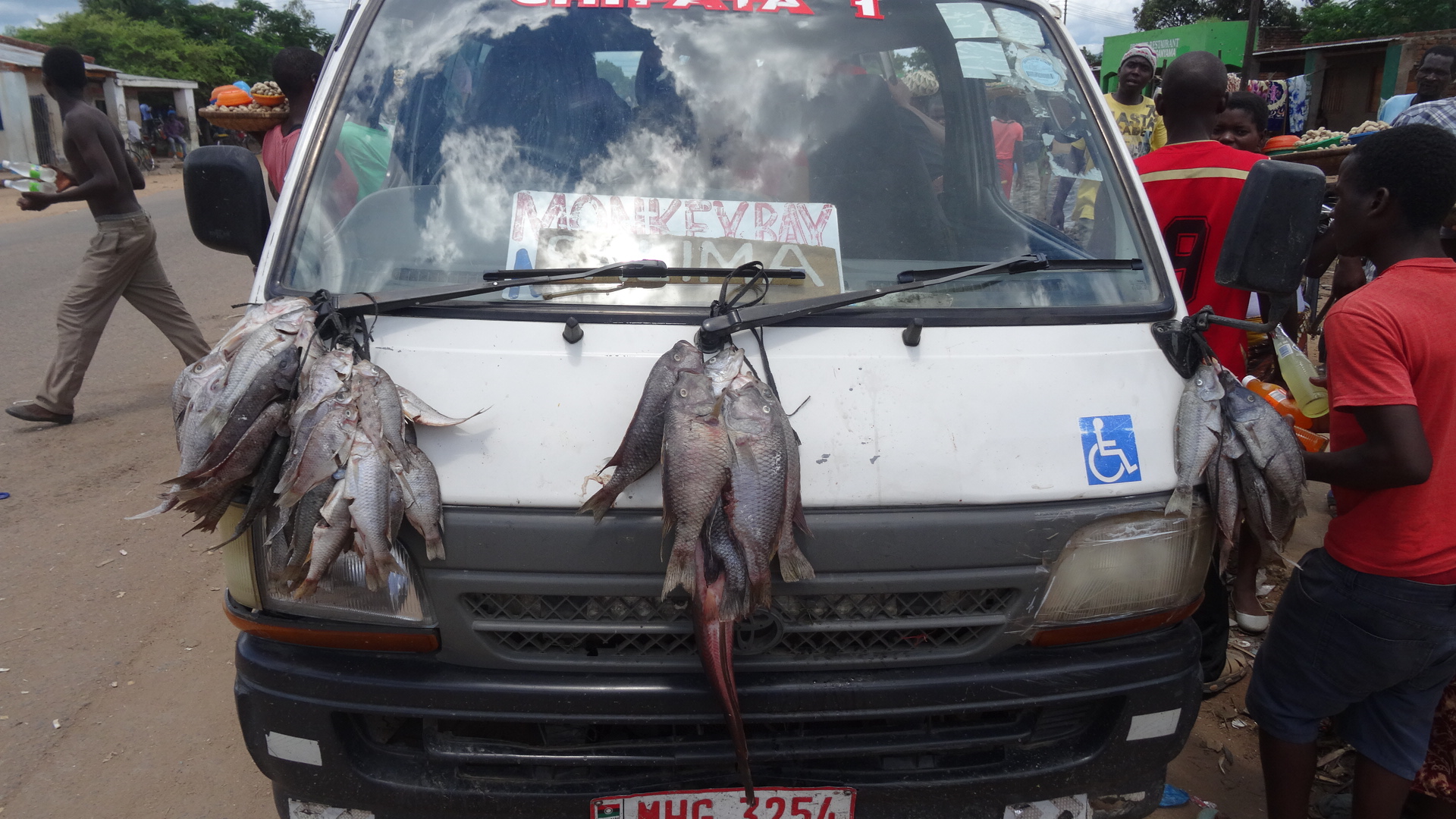 Monday 7th March 2016 – After delicious honey pancakes and black Malawian tea we packed and jumped onto my favourite taxis in Africa so far…the motorbike taxis…wind in our hair, sun on our faces we headed into Monkey Bay town to ask about the passenger ship Ilala…a hundred year old vessel that takes three days to cruise up Lake Malawi and another three days to return to Monkey Bay. They told us the Ilala was running on time so our plan was to catch it at Nkhota Kota on its return journey to Monkey Bay. In the meantime a crooked bus tout had spotted us and was desperate to get us on his brother’s taxi…after some bartering down from a ridiculously inflated price we jumped on and once full off we set. As we passed small villages we watched the people go about their daily business. One market stall was cooking meat, I enquired out of the window what they were cooking and got my answer…goat testicles and penis! Aaron was even tempted to try it but luckily we sped off before he had time! Anything and everything gets put on the taxi buses…today was no exception…cat fish and tiger fish swung from around the wing mirrors and windscreen wipers…a fishy smell floating through the windows invading our western nostrils continuously. On route we tried some sugar cane and shared with the locals. You have to strip it with your teeth and chew to release a refreshingly cool and sweet liquid…a nice pick you up! At one point the sliding door to our vehicle fell off…after much gesticulation and heated conversation it was eventually fixed…for the moment anyway. It was a desperately cramped journey and after changing vehicles 3 times I could hardly breathe and claustrophobia overwhelmed me…I had to get out…at the next stop I launched for the sliding door to reach fresh air and freedom! The driver was lovely and for the remainder of the journey Aaron and I sat in the front seat…it was almost civilised travelling! We arrived at Nkota Kota around 5.30 pm and checked into the Grace Motel. That evening we walked through the evening market…no street lights…everything candle lit…unlike anything I have ever seen. After feasting on local fish and chips we happily fell into bed and a deep sleep.