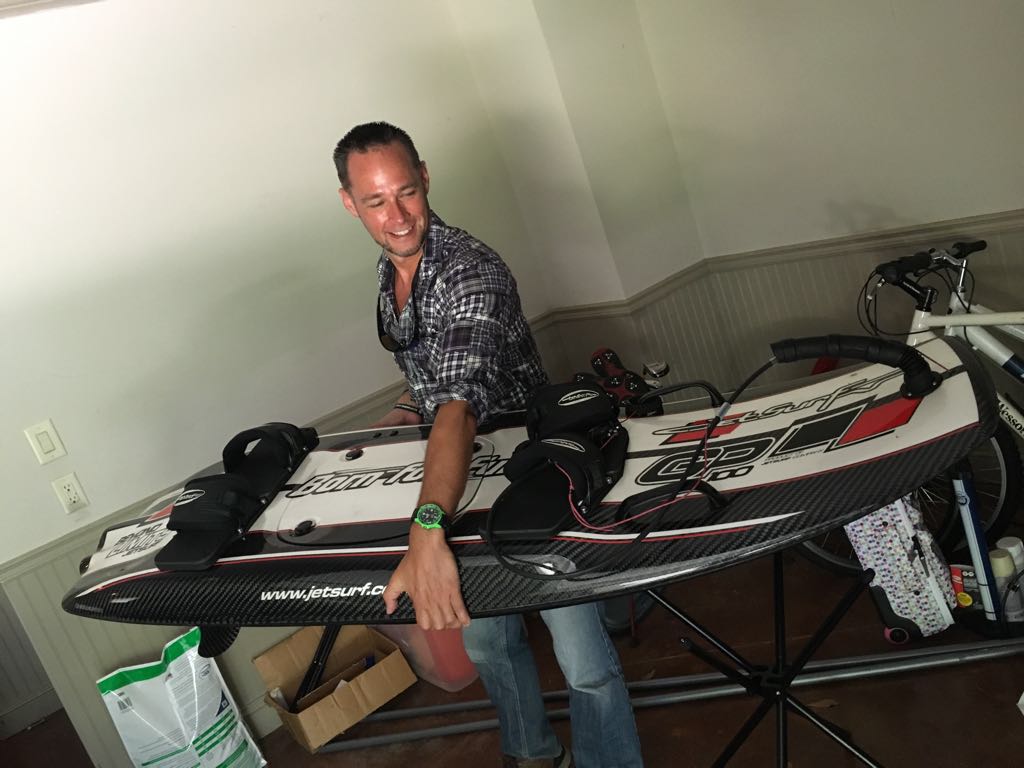 Friday 9th September 2016 – Dunc managed to take the day off work so it was time for some more high adrenaline activities on the lake. This time we took the jet surf with us- a motorised carbon fibre surfboard that no doubt offered new and interesting ways for us to plant our faces in the water. Dunc went first, making it look easy as he sped around like the Silver Surfer, a big grin plastered across his face. Alysa didn’t like the look of it and declined to partake. After a few tries getting used to the controls I was off across the lake, first kneeling and eventually managing to stand- it was great fun and you really felt very cool bombing along at 35mph on a powered surfboard. A couple of hours later the board was out of petrol and we spent the rest of the day on the wakeboard. Under instruction from Dunc I was soon having fun and even came close to surfing without a rope. Back home, Kee, who hadn’t been well enough to join us that day was still feeling poorly. After being put through our paces with another 7 minute workout, we cooked dinner and relaxed in front of the TV.