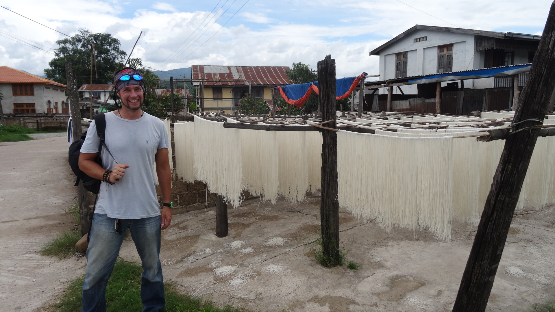 Wednesday 22nd June 2016 – Before going in search of the nearby hot springs we had coffee at a little place by the river. Alysa’s coffee arrived watery and brown and when she asked if it was a cappuccino the owners reply was “yes, cappuccino, no froth” – brilliant! We never did find the hot springs but we did have a wonderful time looking for them. We walked across rice fields, through little streams and down muddy forest paths until we reached a river whose muddy banks were too slippery to ascend. Loads of different types of butterfly fluttered by the paths – a real lepidopterists paradise. Eventually we found ourselves in little Bagan – named for the little collection of old pagodas there. There we ran into the Frenchman we had met on the bus. He started to tell us the history of the place but we made our excuses and left. On the way back we passed a noodle factory where long lines of noodles were hanging out to dry in the sun like washing. As we reached the outskirts of town the heavens opened and by the time we reached our hotel we were utterly soaked. That evening we had a meal at Black House Restaurant by the river. The food was fantastic and the location idyllic.