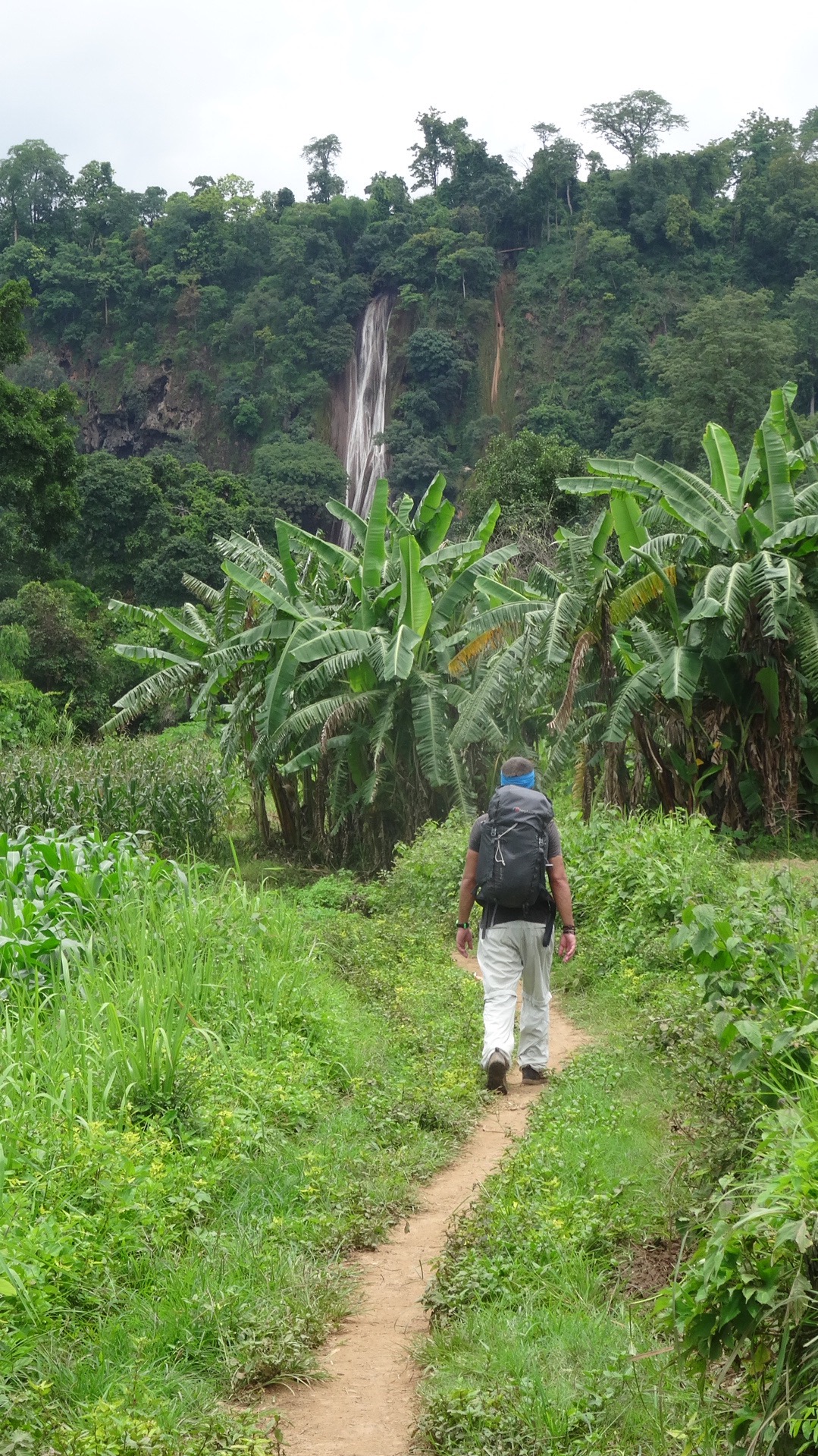 Thursday 23rd June 2016 – I had been hoping to spend a night in the jungle in the mountains behind Indawgyi Lake but they had been mined by the KIA (Kachin Independence Army) so tonight would be the opportunity. We picked up some plastic sheeting that would serve as a tarp from the market in the morning and walked to a nearby waterfall we both wanted to see. The path took us past a Buddhist cemetery, a Chinese cemetery and then a fly infested tip (not marked on the map). The waterfall was lovely and perfect for a refreshing dip after a hot walk. On returning to our clothes we saw they had attracted a number of small bees. They were sweat bees and one that had gone unnoticed stung me as I put on my t shirt. After a bit of lunch I said goodbye to Alysa who was looking forward to unlimited coffee and pastries back in town and headed for the little river we had got stuck at the day before. Wading further up the river led to a little waterfall which could be climbed with the aid of a bit of rope. Eventually the stream bed led out onto the edge of a maize field – just when you think you’re in the middle of nowhere you find someone has planted crops there. Skirting round the field a bit led up a hill back into thick jungle and I happily slashed away at the undergrowth until the handle came off the cheap parang. It was getting late so I strung up my hammock, mosquito net and tarp, smothered myself in deet and settled in for the night, listening to the sounds of the jungle. Fireflies blinked their green light all around and bats that must have been roosting in trees nearby flew into the mosquito net which I guess was too thin to show on their radar. I was too excited to sleep much and instead rigged up my sarong with my headtorch underneath it to attract insects the way naturalists do on tv. Unfortunately, apart from a few very small flies nothing seemed interested in the light at all.